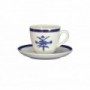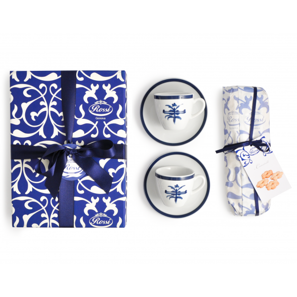 Il set è composto da 2 Tazzine da caffè con piattino decoro Ragno Genovese Radif (2x1BD61/62) e 1 confezione di canestrelli di Rossi 1947. Il tutto confezionato in scatola regalo blu e bianca.