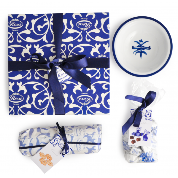 Il set è composto da 1 Coppetta da cm. 16 decoro Ragno Genovese Radif (1BD51) , 1 sacchetto da 150 gr di cioccolatini Tartufi e 1 confezione di canestrelli di Rossi 1947. Il tutto confezionato in scatola regalo blu e bianca.