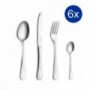 La confezione comprende 6 Cucchiai Tavola, 6 Forchette Tavola, 6 Coltelli Tavola, 6 Forchette Frutta, 6 COltelli Frutta, 6 Cucchiaini. Una linea moderna ed elegante ideale per una tavola lineare e curata. Lo speciale trattamento VINTAGE rende la posata molto originale e in linea con le attuali tendenze della tavola.