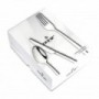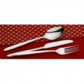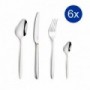 La confezione comprende 6 Cucchiai Tavola, 6 Forchette Tavola, 6 Coltelli Tavola, 6 Cucchiaini. Una linea moderna ed elegante ideale per una tavola lineare e curata.