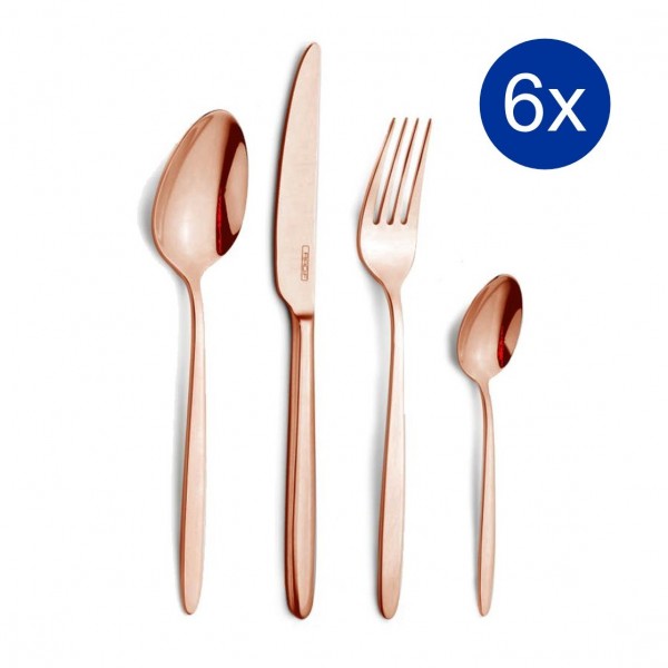 La confezione comprende 6 Cucchiai Tavola, 6 Forchette Tavola, 6 Coltelli Tavola, 6 Cucchiaini. Una linea moderna ed elegante ideale per una tavola lineare e curata. Il rivestimento color RAME in pvd rende la posata originale ed esclusiva.