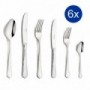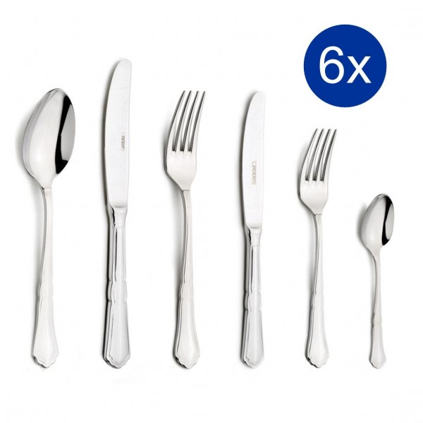 La confezione comprende 6 Cucchiai Tavola, 6 Forchette Tavola, 6 Coltelli Tavola, 6 Forchette Frutta, 6 Coltelli Frutta, 6 Cucchiaini. La linea Erica di stile Retrò ha una forte originalità della forma che ricorda le antiche linee di posateria ma con un tocco di novità.