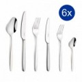 La confezione comprende 6 Cucchiai Tavola, 6 Forchette Tavola, 6 Coltelli Tavola, 6 Forchette Frutta, 6 Coltelli Frutta, 6 Cucchiaini. Una linea moderna ed elegante ideale per una tavola lineare e curata.