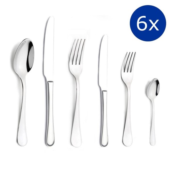 La confezione comprende 6 Cucchiai Tavola, 6 Forchette Tavola, 6 Coltelli Tavola manico Vuoto, 6 Forchette Frutta, 6 Coltelli Frutta manico Vuoto, 6 Cucchiaini. Questa linea di posate è molto versatile, si abbina sia alle tavole classiche che a quelle moderne e lineari. Il coltello bombato a manico vuoto dona importanza alla linea, mentre quello a manico pieno le conferisce maggior essenzialità.