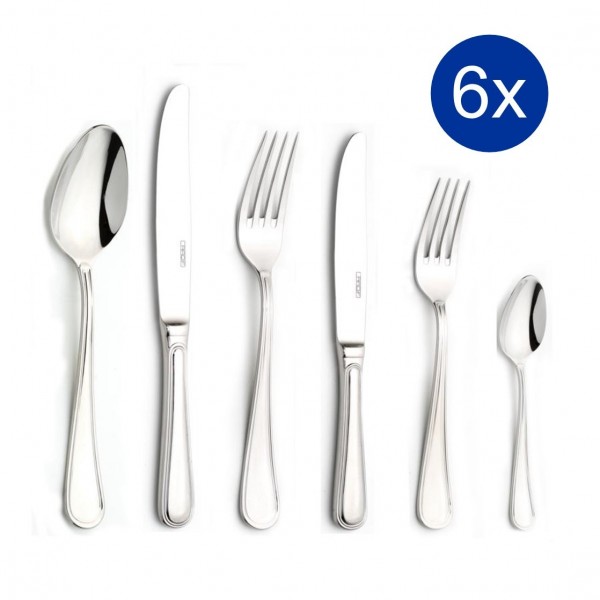 La confezione comprende 6 Cucchiai Tavola, 6 Forchette Tavola, 6 Coltelli Tavola, 6 Forchette Frutta, 6 Coltelli Frutta, 6 Cucchiaini.La linea Viola è la classica posata di stile inglese in uso in molteplici situazioni. Molto versatile ed elegante, si adatta anche a location più moderne e lineari proprio per la sua caratteristica di stile senza tempo.